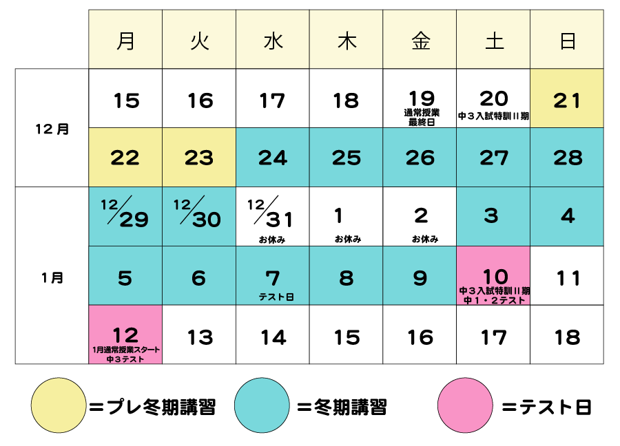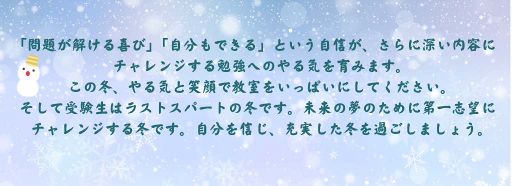 冬期講習期間中の通常授業はありません。1月の通常授業は1月12日(月)からスタート!