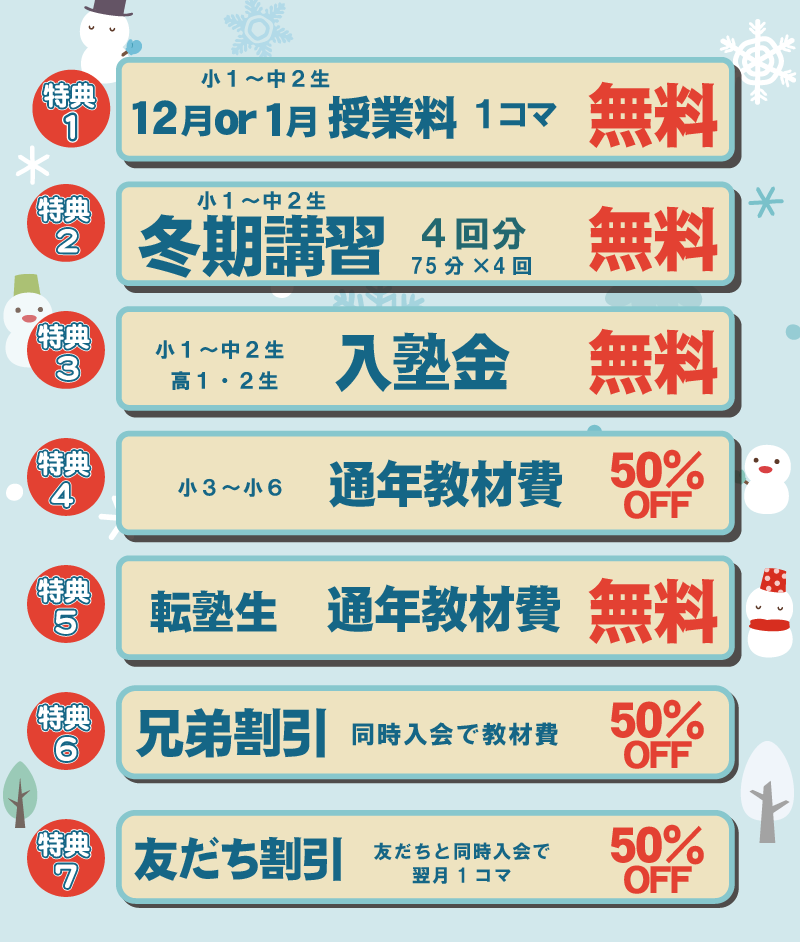 ※特典①②④⑤⑥は小学生2コマ以上・中学生4コマ以上・高校生2コマ以上申し込みの方対象です。