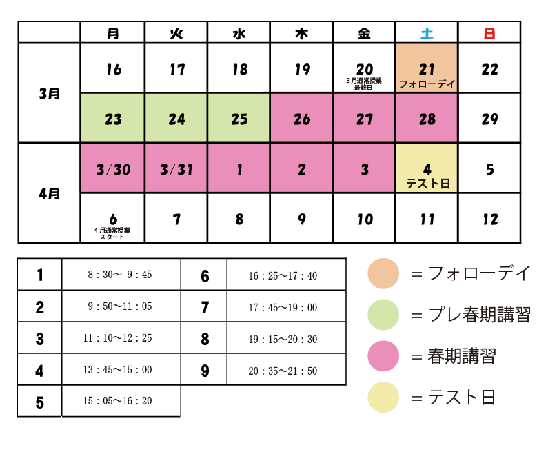 - 3月21日(土)はフォローデイです。 初めての方が春期講習をスムーズに受けられるようにするための、プレ学習デイです。