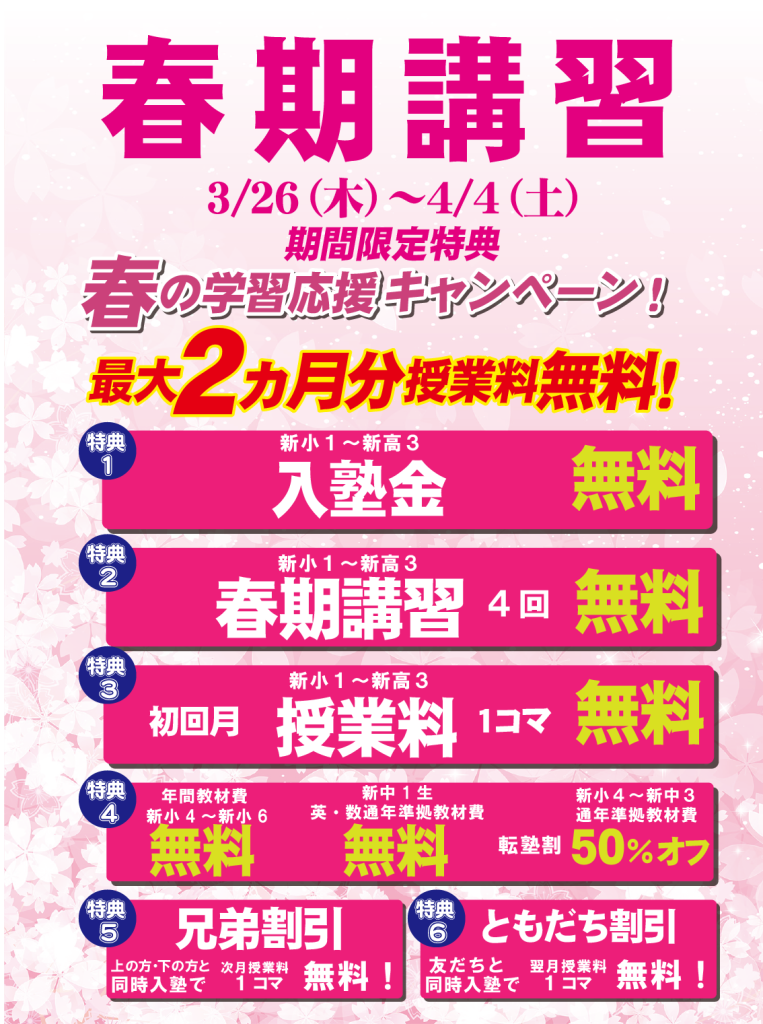 4月4日(土)までに新規入塾手続きされた方が上記特典を受けられます。